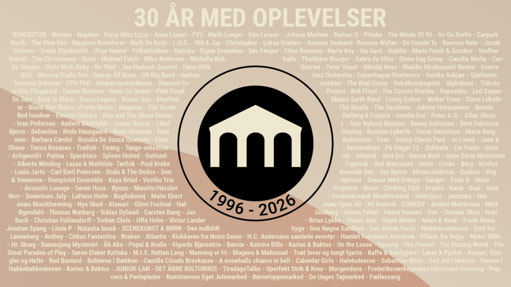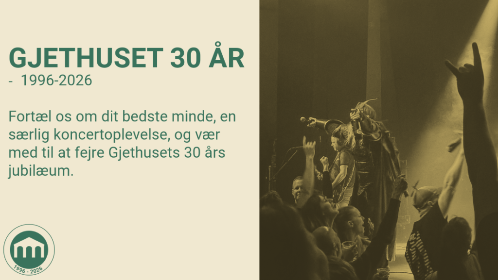 Jubilæumsåret byder på en række oplevelser med både historisk forankring og fællesskabet i centrum. Glæd dig blandt andet til en særudstilling i samarbejde med Industrimuseet Frederiks Værk, jubilæumsfortælling med vores kunstfrivillige Wilhelm Stege & direktør Betina Louise Kimergård, der fortæller om husets historie fra kanonstøberi til kulturhus samt stemningsfulde arrangementer som fællesspisning, fællessang og musikbanko. Her sætter vi fokus på den musik og de oplevelser, der har været med til at forme Gjethuset gennem de seneste 30 år.